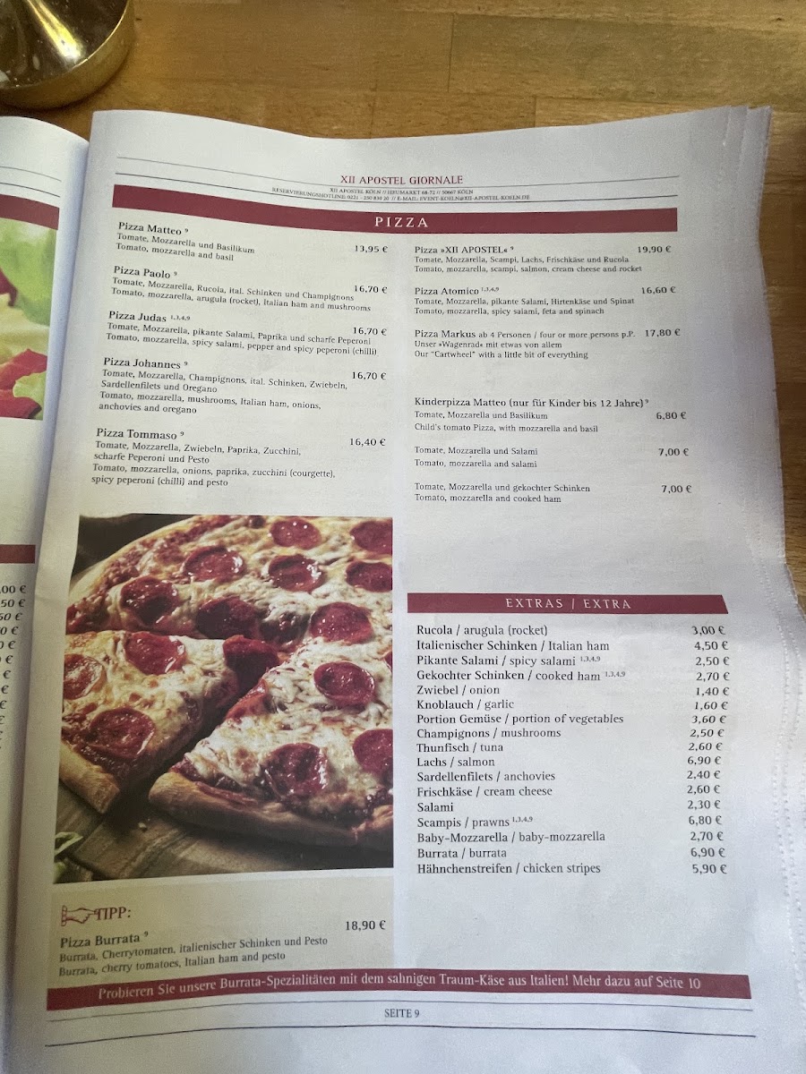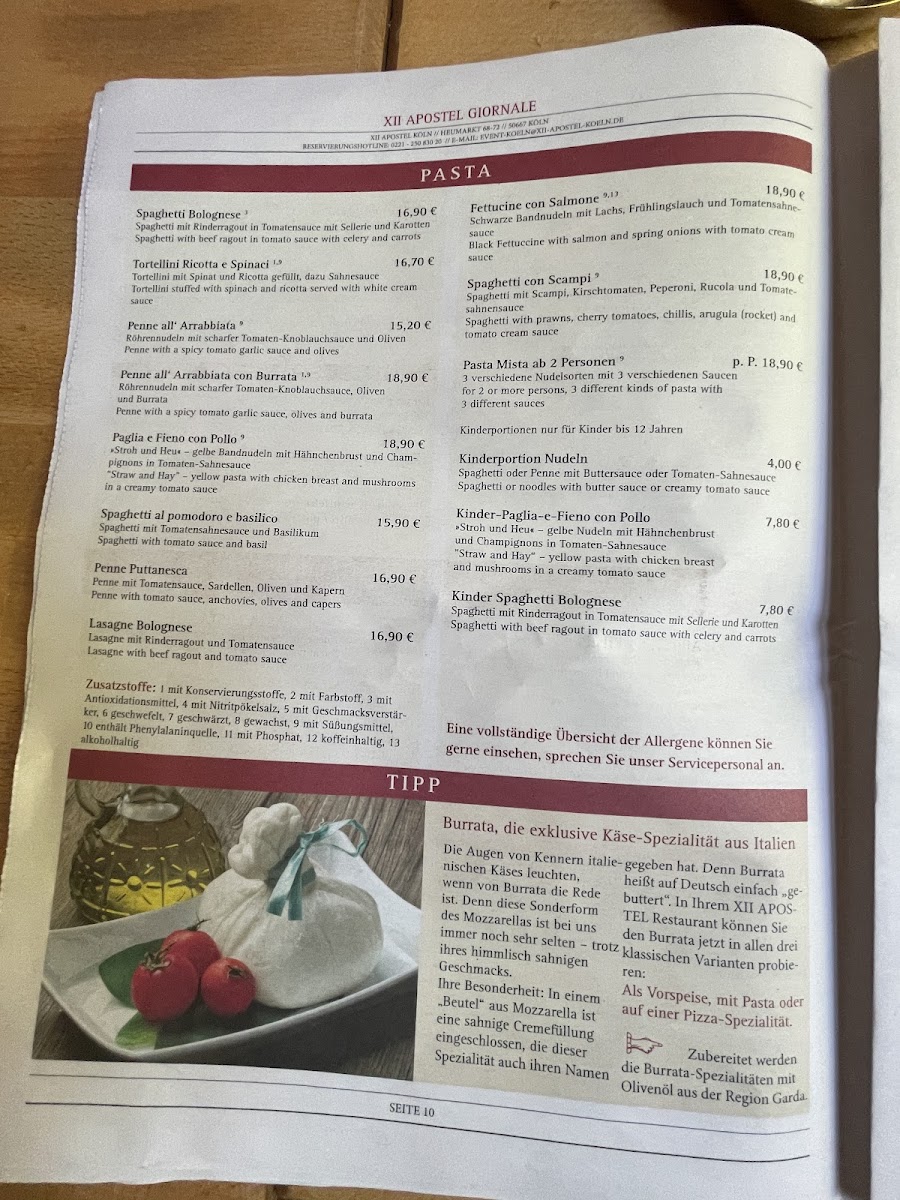 Welcome to XII Apostel Koln, a delightful Italian restaurant nestled in the heart of Cologne at Heumarkt 68-72. This charming spot offers a diverse menu that caters to every palate, from classic pasta dishes like Spaghetti Bolognese (€14.90) and Tortellini Ricotta e Spinaci al Gorgonzola (€14.90) to zesty Penne all’Arrabbiata (€13.70). The restaurant also boasts a special kids’ menu, making it a family-friendly destination.